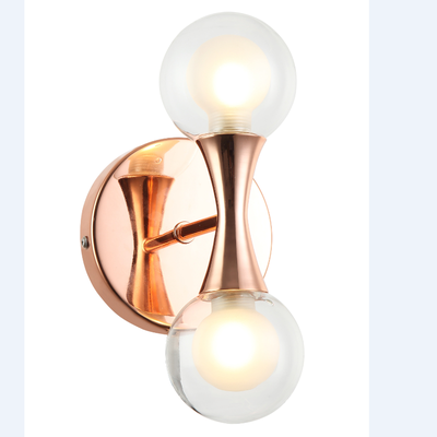 É feita de metal com acabamentos na cor cobre/rosê e sua cupula de vidro transparente com soquetes para G9.
